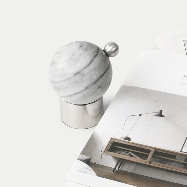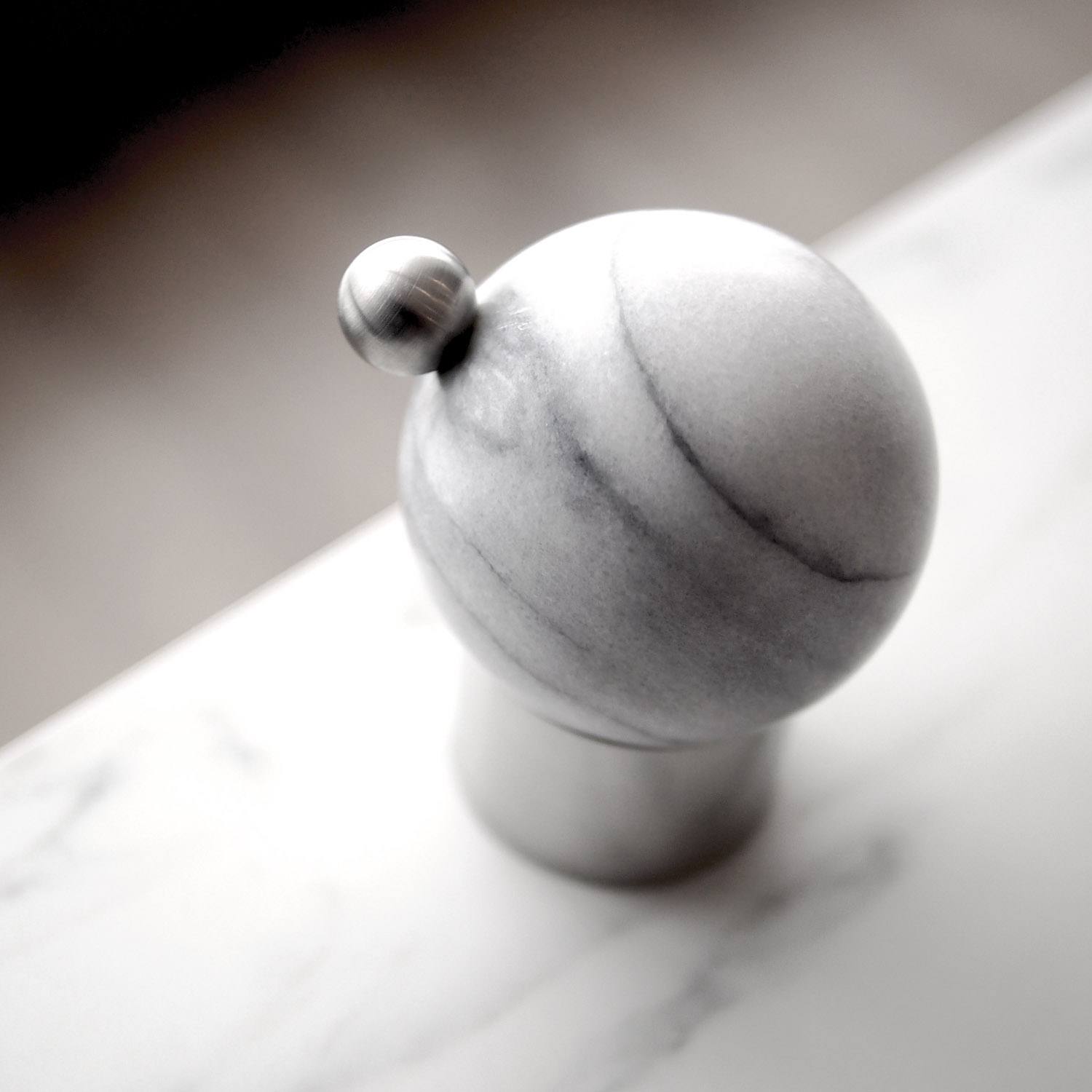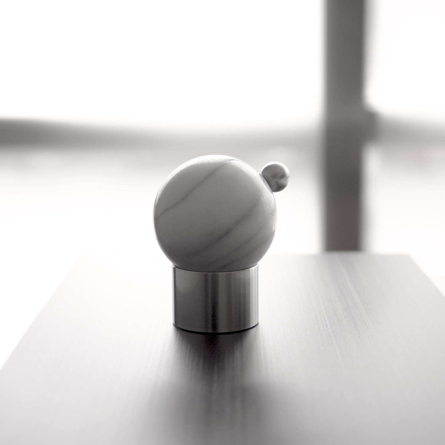 白色大理石和不銹鋼球型把手,搭配拉絲不銹鋼基座,台灣製造。大理石為天然材料,其紋路各有差異,紋理不一有其各自的呈現之色澤效果。