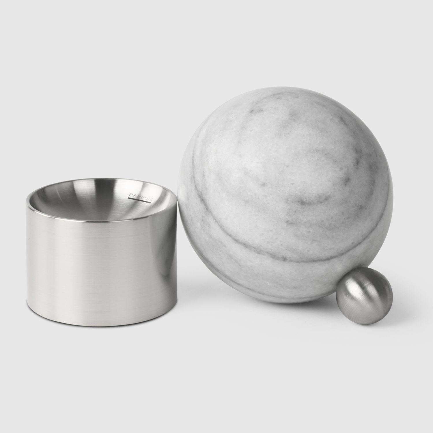 藉由轉動大理石球體,使不鏽鋼底座內的精油吸附在大理石球面的細微毛孔上,